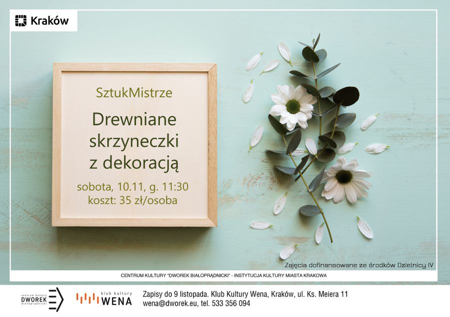 Nowy cykl sobotnich wydarzeń w Klubie Wena. Raz w miesišcu będziemy spotykać się, aby rozwinšć swojš kreatywnoœć i oswoić techniki sztuki. Za każdym razem w nowš metodš będziemy wytwarzać przedmiot użytkowy lub ozdobę. Bieżšce informacje na stronie: wena.dworek.eu