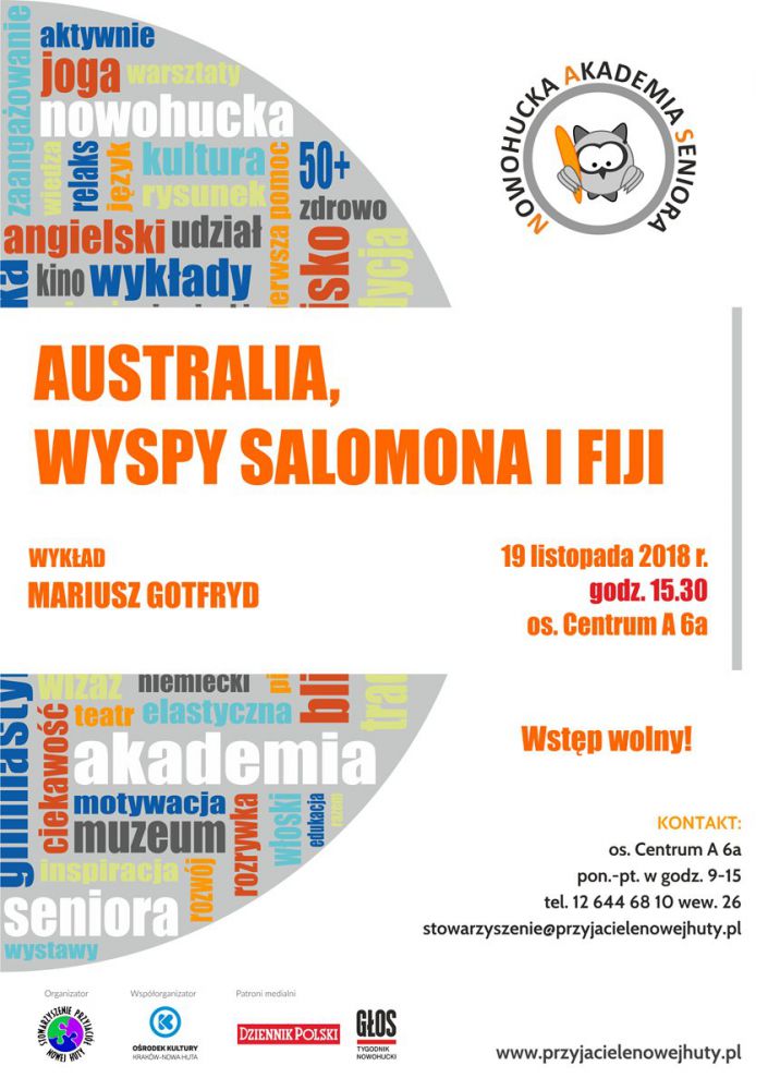 Nowohucka Akademia Seniora (os. Centrum A 6a) zaprasza 19 listopada o godz. 15.30 na spotkanie z geografem i podrnikiem - Mariuszem Gotfrydem, ktry opowie i zaprezentuje kadry ze swojej podry po Australii, Wyspach Salomona i Fiji.