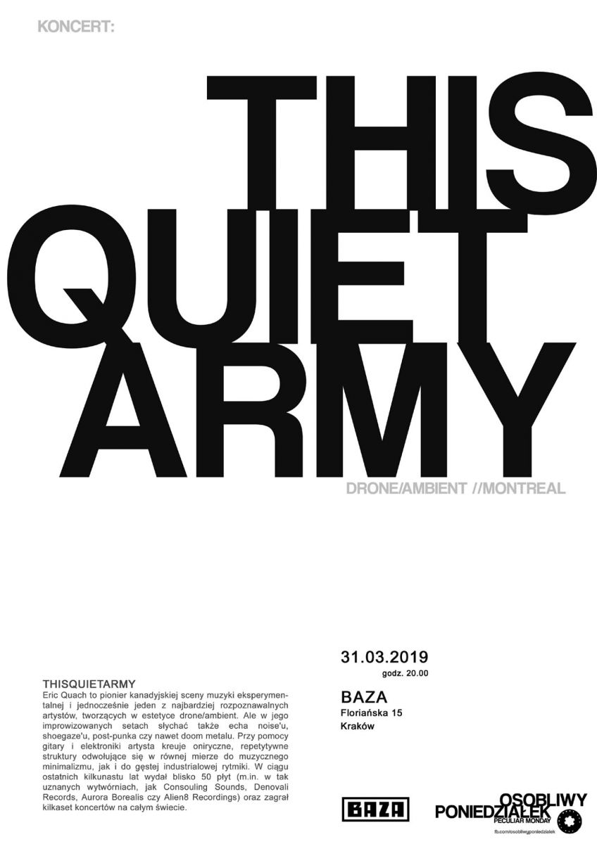 Eric Quach to pionier kanadyjskiej sceny muzyki eksperymentalnej i jednoczenie jeden z najbardziej rozpoznawalnych artystów, tworzčcych w estetyce drone/ambient. Ale w jego improwizowanych setach słychaæ także echa noise'u, shoegaze'u, post-punka czy nawet doom metalu. Przy pomocy gitary i elektroniki artysta kreuje oniryczne, repetytywne struktury odwołujčce siê w równej mierze do muzycznego minimalizmu, jak i do gêstej industrialowej rytmiki. W cičgu ostatnich kilkunastu lat wydał blisko 50 płyt (m.in. w tak uznanych wytwórniach, jak Consouling Sounds, Denovali Records, Aurora Borealis czy Alien8 Recordings) oraz zagrał kilkaset koncertów na całym wiecie.