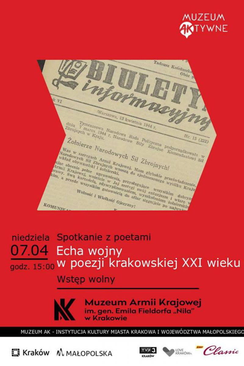 Serdecznie zapraszamy na wieczór, na którym po raz drugi w murach Muzeum Armii Krajowej w Krakowie zagoœci poezja współczesna tworzona przez krakowskie Poetki i Poetów z różnych œrodowisk twórczych.