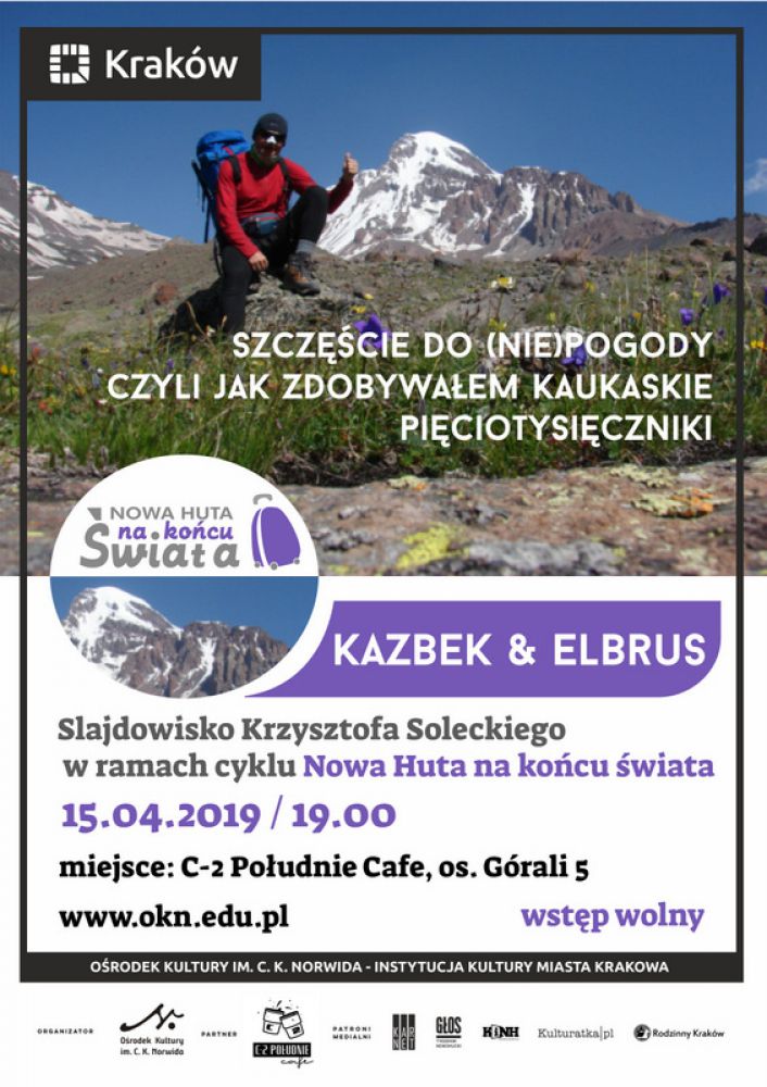 Często po wyprawie nasuwa się refleksja, jak to jest z tym szczęciem do pogody podczas wyprawy. Ile trzeba szczęcia aby choć przez chwilę zobaczyć ze szczytu skrawek otaczajšcego wiata. Podczas slajdowiska opowiem o swojej wyprawie na Kazbek i Elbrus, o pogodzie, kawie, utracie wzroku partnerki i o pomylonej drodze, którš dzień wczeniej przechodziłem.