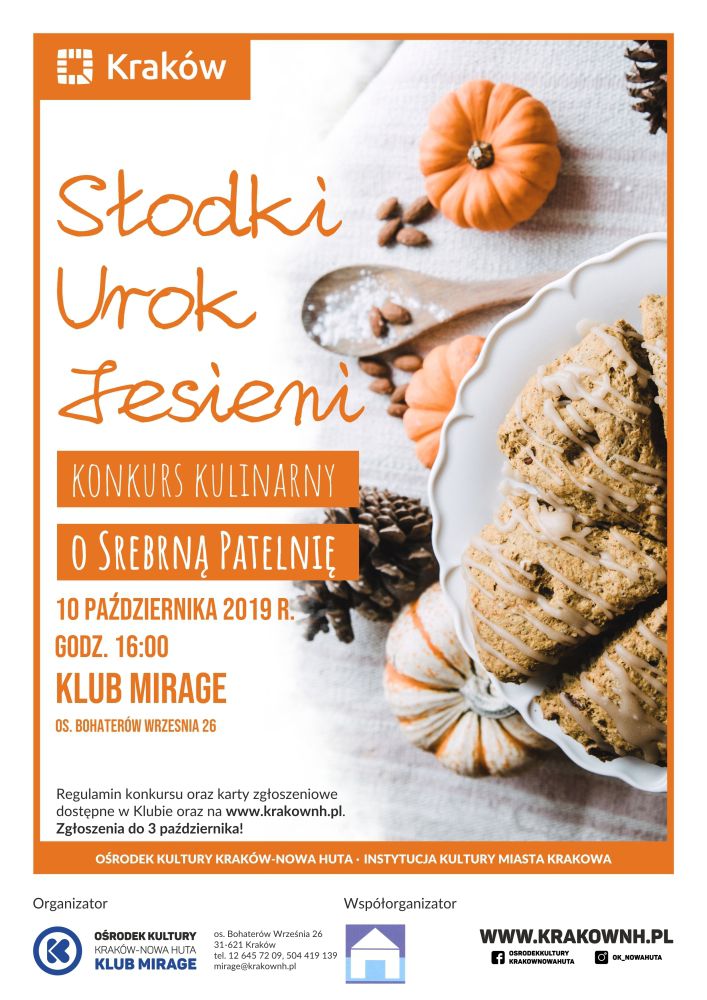 Osoby chętne, by podzielić się swoim najlepszym przepisem na ciasto w jesiennym klimacie i wzišć udział w konkursie proszone sš o zgłaszanie uczestnictwa w Klubie Mirage Oœrodka Kultury Kraków-Nowa Huta (os. Bohaterów Wrzeœnia 26) do 3 paŸdziernika. Szczegóły konkursu w Regulaminie dostępnym w Klubie oraz na stronie internetowej www.krakownh.pl.