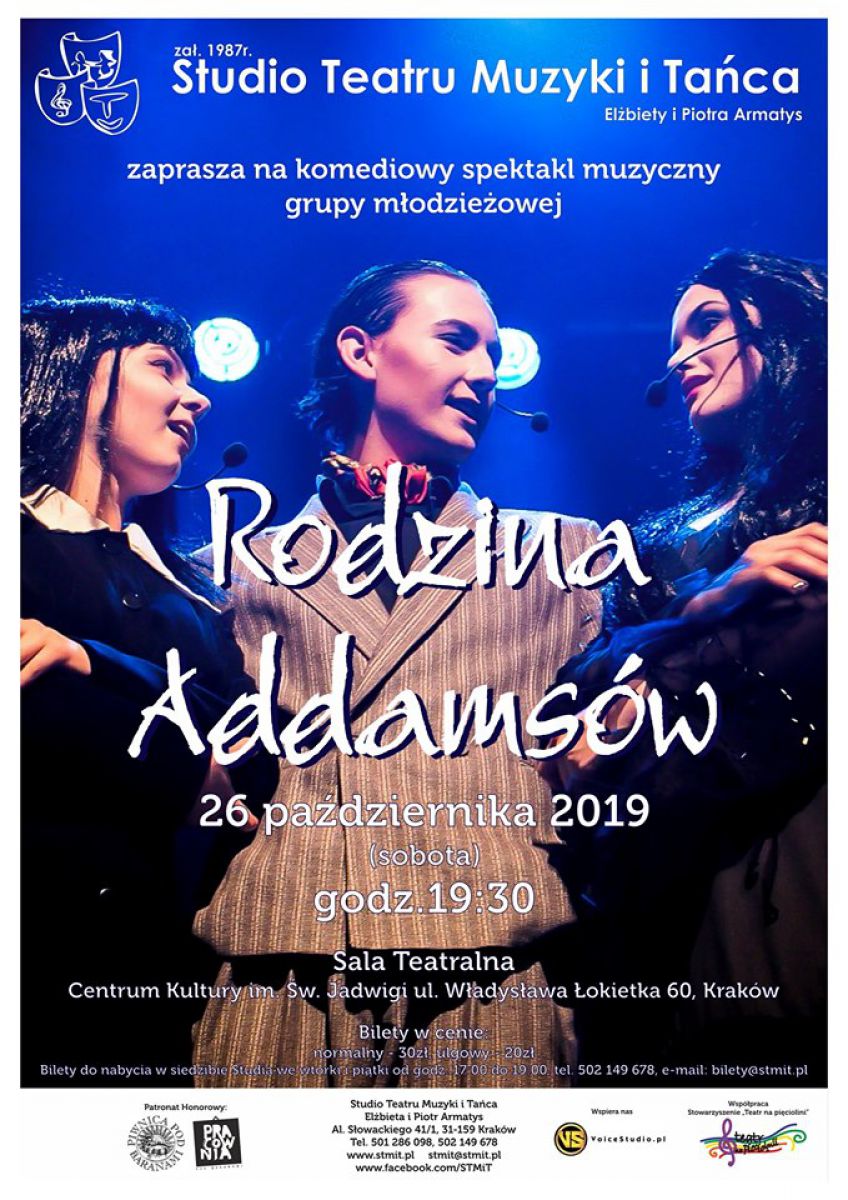 Serdecznie zapraszamy na komediowy spektakl muzyczny "Rodzina Addamsów" w wykonaniu grupy młodzieżowej Studia Teatru Muzyki i Tańca