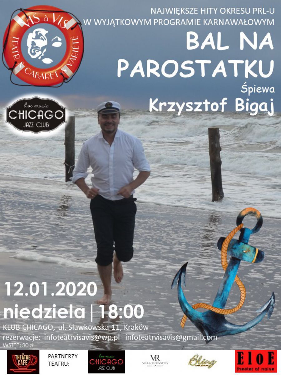 Pieszo, autostopem, a może pocišgiem byle jakim? Jeli chcecie Państwo połšczyć podróż w czasie z dobrš zabawš, to tylko podczas rejsu parostatkiem i jedynie z rozpiewanym kapitanem, który z muzyki lat 60 i 70 wyłowi dla Was bezcenne perły - przypomni melodyjne hity towarzyszšce licznym zabawom minionych lat, jednoczenie niebanalne teksty, piosenki melancholijne i emocjonalne. Zapraszamy na karnawałowy BAL NA PAROSTATKU pełnš humoru oraz interakcji muzyczno-sytuacyjnš prywatkę.