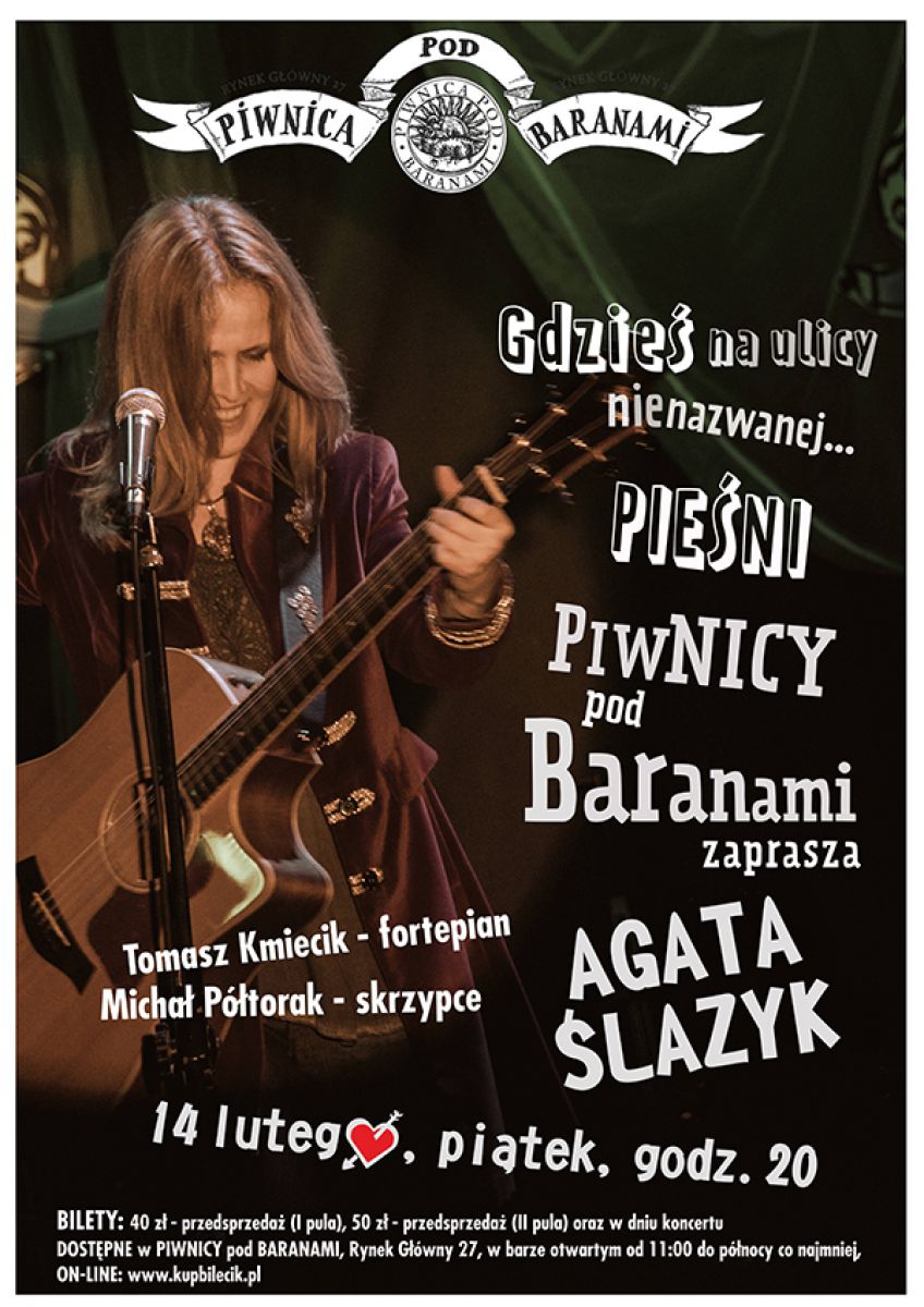 Agata Œlazyk jest artystkš zwišzanš na co dzień z zespołem Piwnicy pod Baranami. Recital złożony z piwnicznych utworów jest naturalnš konsekwencjš czasu spędzonego w legendarnym kabarecie. Artystka wybrała z piwnicznego archiwum pieœni, które w pełni zgadzajš się z jej emocjami i doœwiadczeniem. Połšczenie temperamentu z wrażliwoœciš wokalistki owocuje tym, że znane piwniczne utwory uzyskujš œwieży,