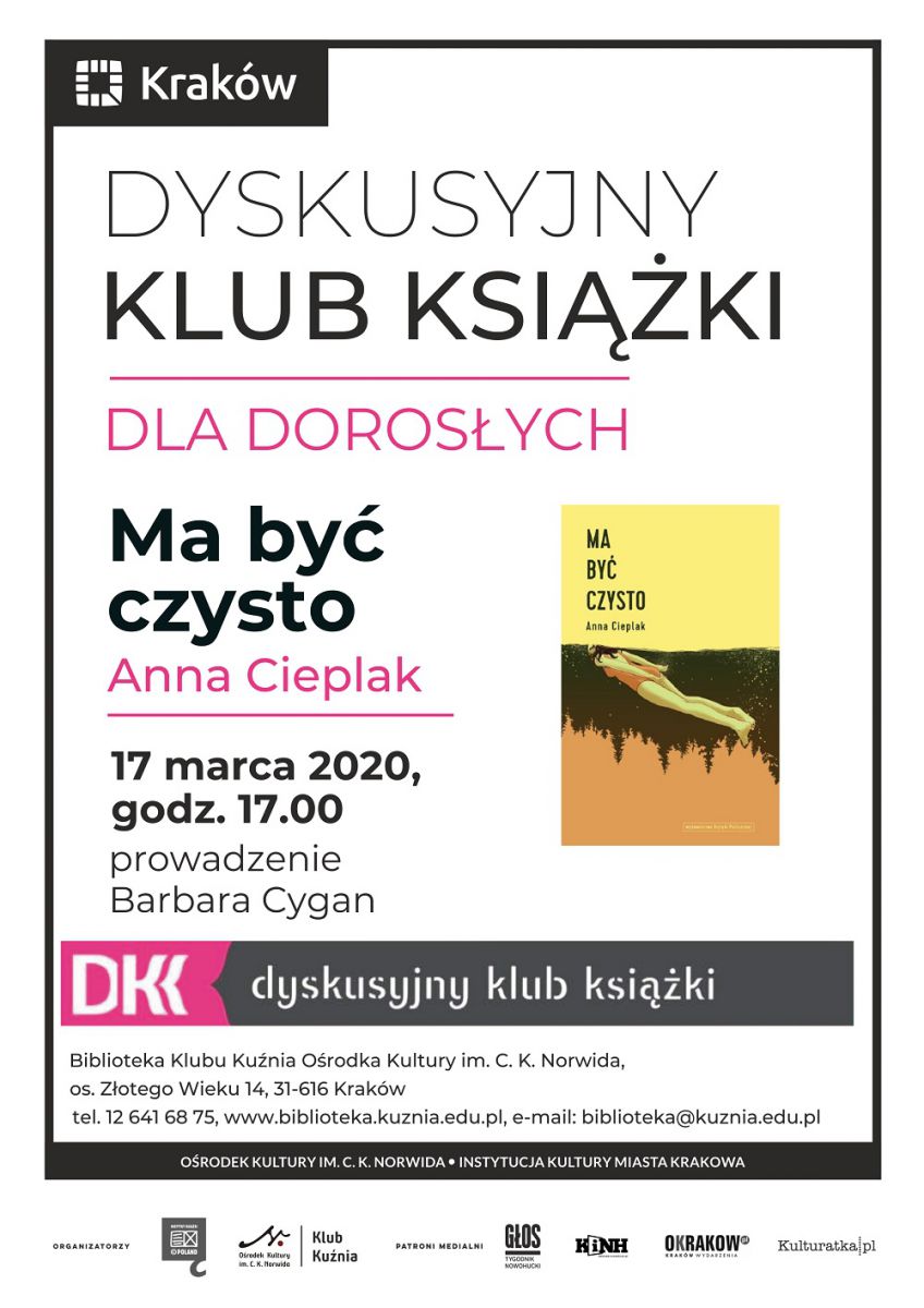 W marcu porozmawiamy o ksišżce Anny Cieplak pt. Ma być czysto. Spotkanie poprowadzi Barbara Cygan. Wstęp wolny.