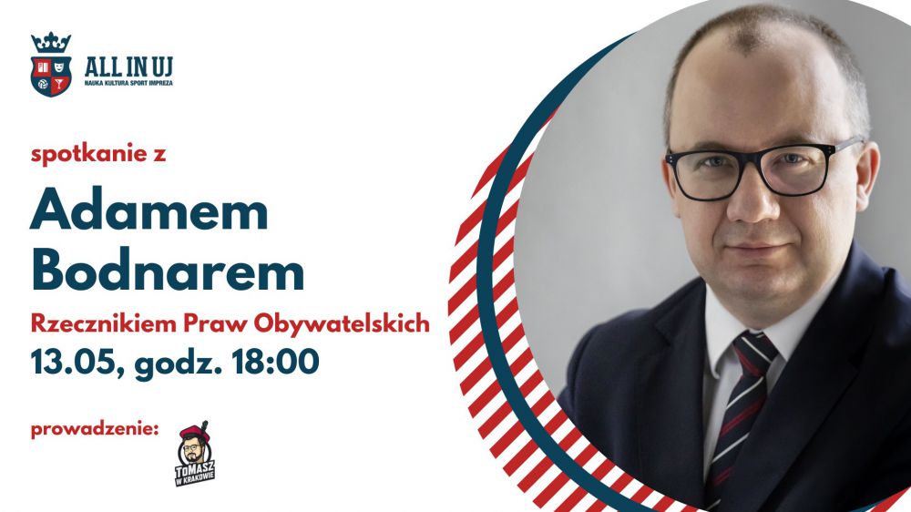 Serdecznie zapraszamy na spotkanie z dr. hab. Adam Bodnar, Rzecznikiem Praw Obywatelskich. Na wydarzenie zapraszamy #online. Rozmowa będzie toczyć się na żywo, więc zachęcamy do zadawania pytań w komentarzach i uczestnictwa. Transmisja rozpocznie się 13 maja ok. godziny 18.00 na fanpejdżu All In UJ (link umiecimy również w tym wydarzeniu).