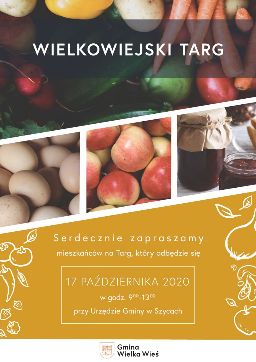 Serdecznie zapraszamy na Wielkowiejski Targ, który odbędzie się 17.10.2020 r. w godz. 9.00-13.00 przy Urzędzie Gminy.