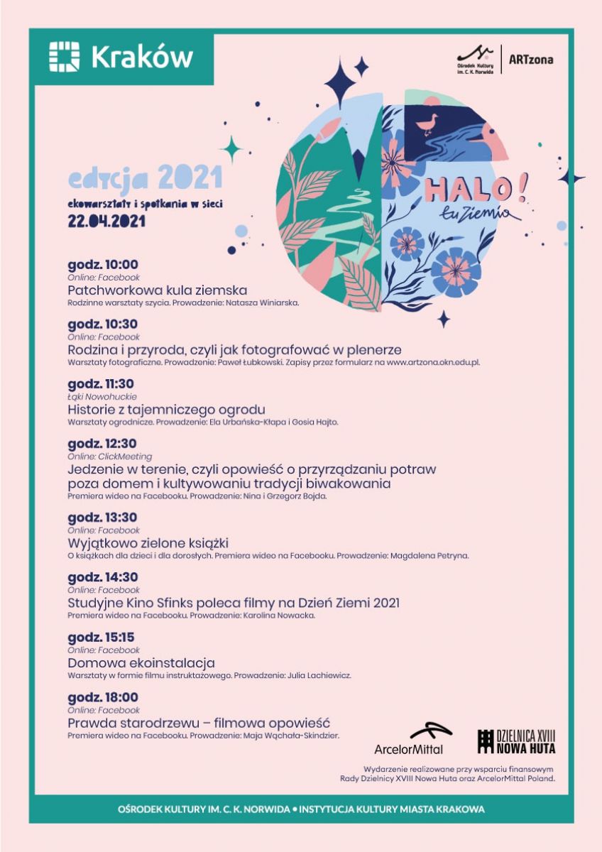 Z okazji Dnia Ziemi zapraszamy na specjalne wydanie wydarzenia „Halo! Tu Ziemia!”. 22 kwietnia 2021 r. od godz. 10:00 będzie czekało na Was – i na małych i na dużych – mnóstwo zielonych atrakcji. Uszyjemy patchworkowš kulę ziemskš, pobawimy się w ogrodników, spotkamy Z twórcami bloga „Jedzenie w terenie”, którzy opowiedzš o tym, jak przyrzšdzać zdrowe i atrakcyjne potrawy poza domem i jak kultywować tradycję biwakowania, stworzymy domowš ekoinstalację, polecimy Wam wyjštkowe filmy i ksišżki, których głównym bohaterem jest natura. A na koniec dnia Maja Wšchała-Skindzier z Nowohuckiego Laboratorium Dziedzictwa zabierze nas w filmowš podróż, snujšc opowieœć o „Prawdzie Starodrzewu”. Zaprosimy Was także do udziału w specjalnych zielonych warsztatach fotograficznych.