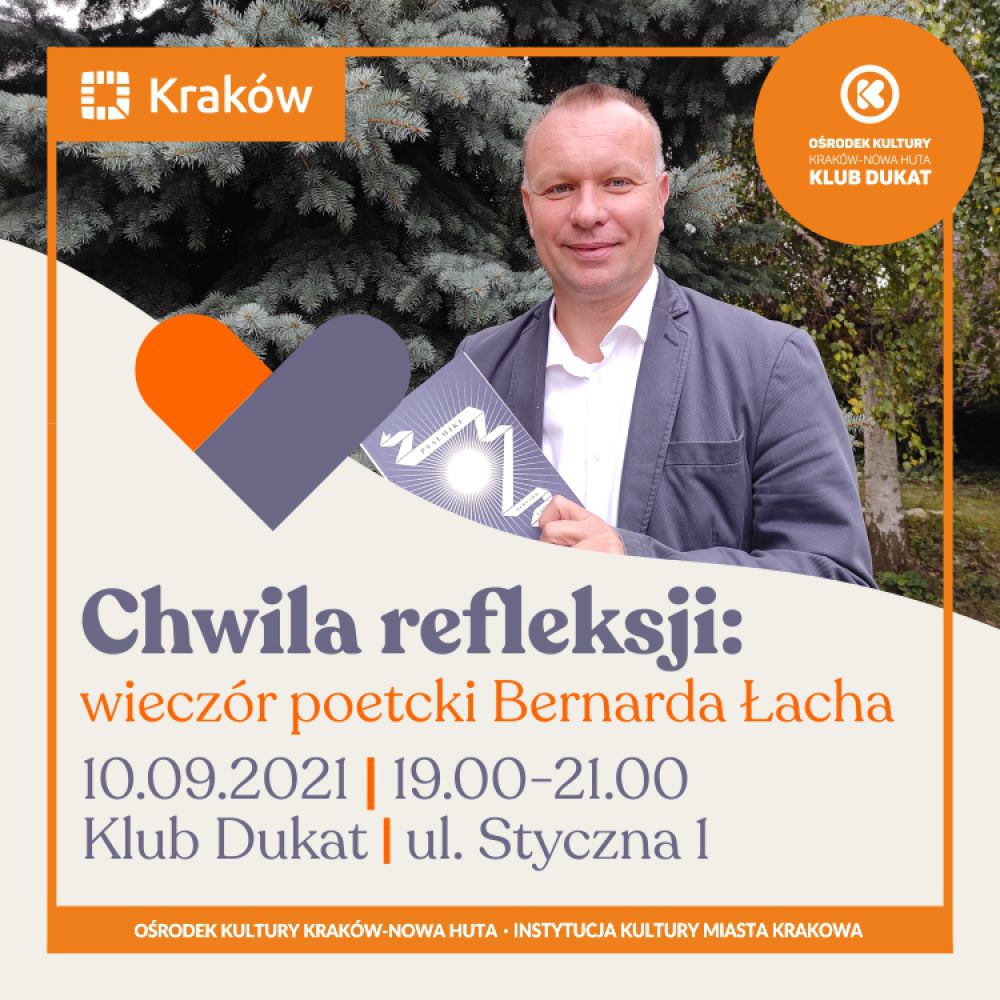 Klub Dukat Oœrodka Kultury Kraków-Nowa Huta zaprasza na wieczór poetycki, którego goœciem będzie bardzo barwna postać - Bernard Łach. Zaproszony goœć to oligofrenopedagog, katecheta, trener UEFA A, przyjaciel osób niepełnosprawnych i mieszkaniec Grębałowa. Od 2008 roku z przerwami publikuje na portalach poezja-polska.pl oraz publixo.com. Jest członkiem Grupy Literackiej Sylaba oraz Koła Młodych przy Stowarzyszeniu Pisarzy Polskich Oddział w Krakowie. Od blisko 30 lat działa w Ruchu Wiara i Œwiatło Ziarenka. Od 20 lat pracuje jako katecheta i pedagog w Zasadniczej Szkole Specjalnej w Nowej Hucie, gdzie prowadzi grupę wsparcia "Przystanek PrzyjaŸń" oraz szkolnš drużynę piłki nożnej. Jest członkiem zarzšdu, spikerem i trenerem drużyny oldbojów. Prywatnie mšż Moniki i ojciec Zuzanny i Korneli. Udział bezpłatny.
