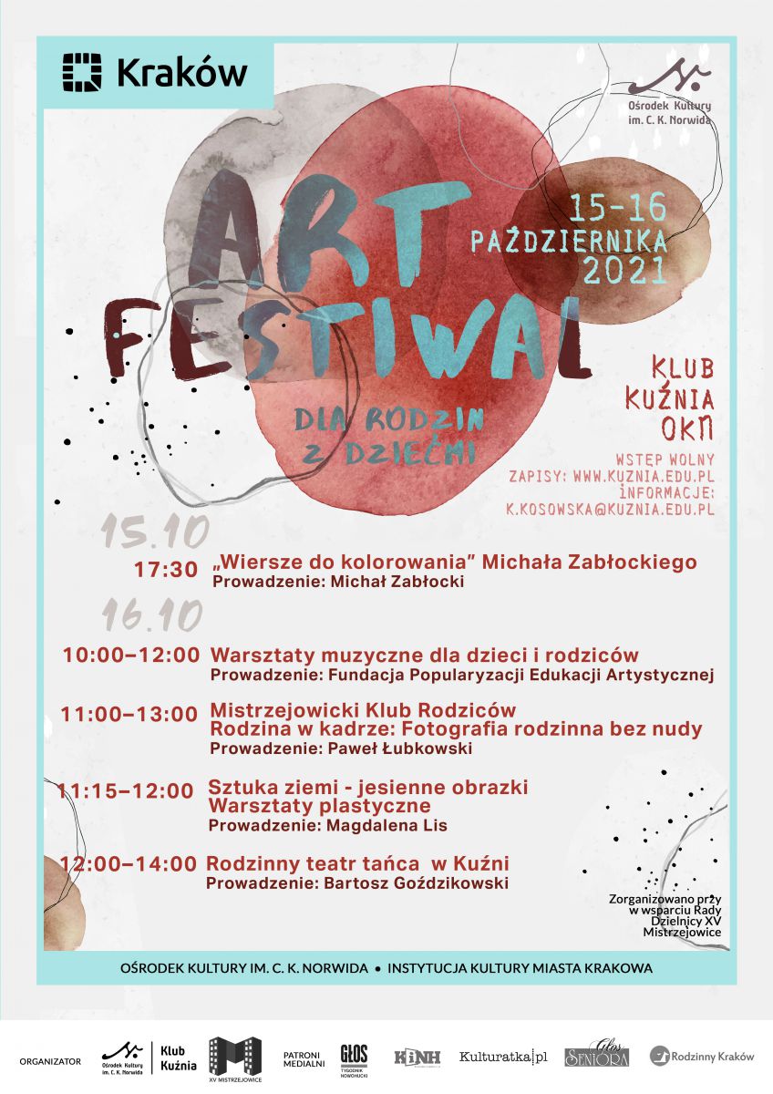 Art festiwal dla rodzin z dziećmi, czyli czas artystycznych doœwiadczeń i odkryć adresowany do najmłodszych, ich rodziców i opiekunów. Zapraszamy 15 i 16 paŸdziernika do Klubu KuŸnia na cykl warsztatów artystycznych. W programie: warsztaty literackie Michała Zabłockiego, tworzenie instrumentów muzycznych, sztuka ziemi, rodzinny teatr tańca i warsztaty fotograficzne.