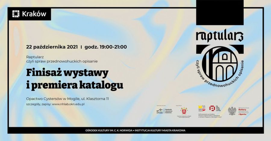 19:00 21.00. Uroczyste zamknięcie wystawy Raptularz, czyli spraw przednowohuckiCh opisanie, uwietnione humorystycznš projekcjš filmu making off z rejestracji z projektu Raptularz, czyli spraw przednowohuckich opisanie oraz zapowiedziš na dalsze działania (jubileusz 800-lecia opactwa, działalnociš muzeum), wręczeniem wszystkim obecnym bezpłatnego katalogu wystawy oraz gadżetów promocyjnych tego projektu (maseczki i torby).