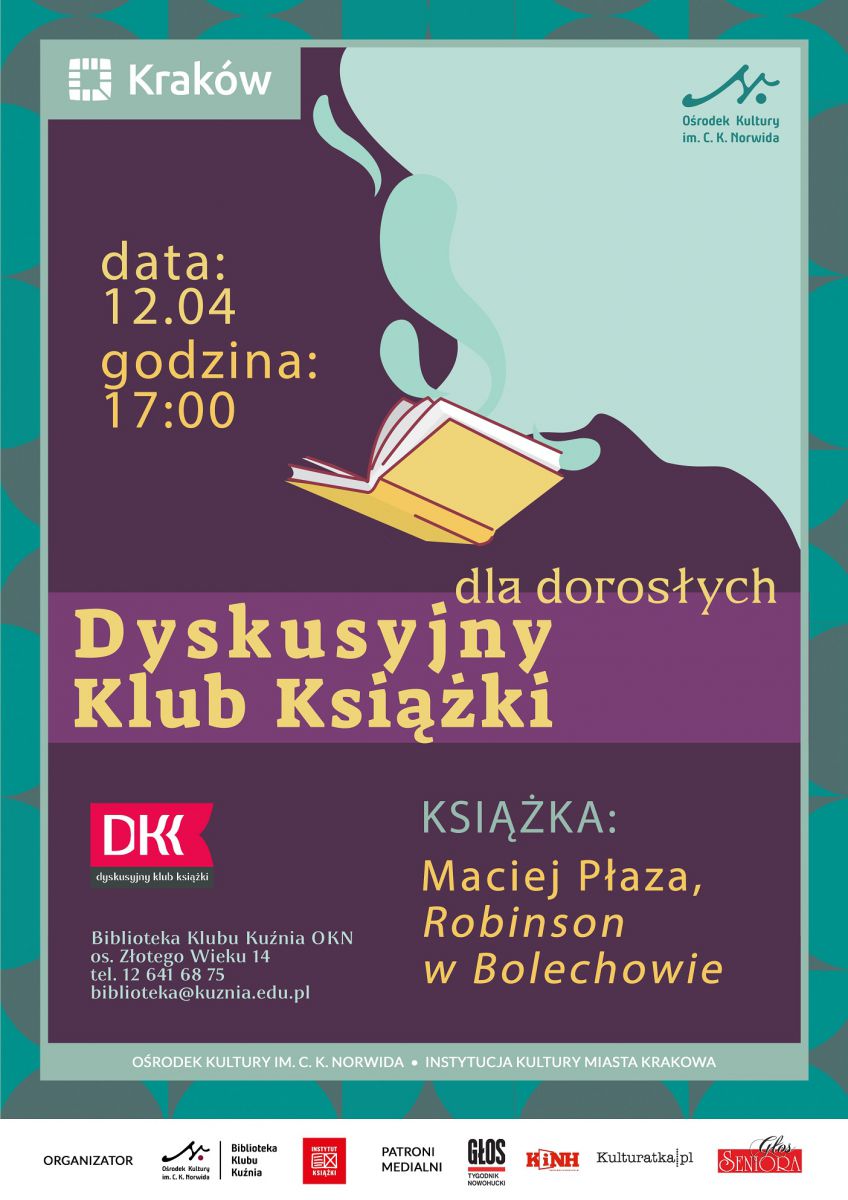 Podczas kwietniowego spotkania Dyskusyjnego Klubu Ksiki dla dorosych uczestnicy bd rozmawia na temat ksiki Macieja Pazy, zatytuowanej Robinson w Bolechowie.