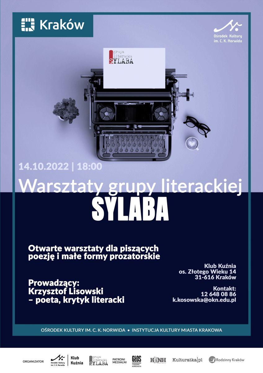 Zapraszamy piszących poezję i małe formy prozatorskie. Zachęcamy do przyniesienia tekstów – zostaną wysłuchane z uwagą, a uczestnicy mogą liczyć na życzliwą pomoc ekspertów. Warsztaty Sylaby prowadzili dotychczas Elżbieta Zechenter-Spławińska, Michał Zabłocki, a od 2021 roku Krzysztof Lisowski.