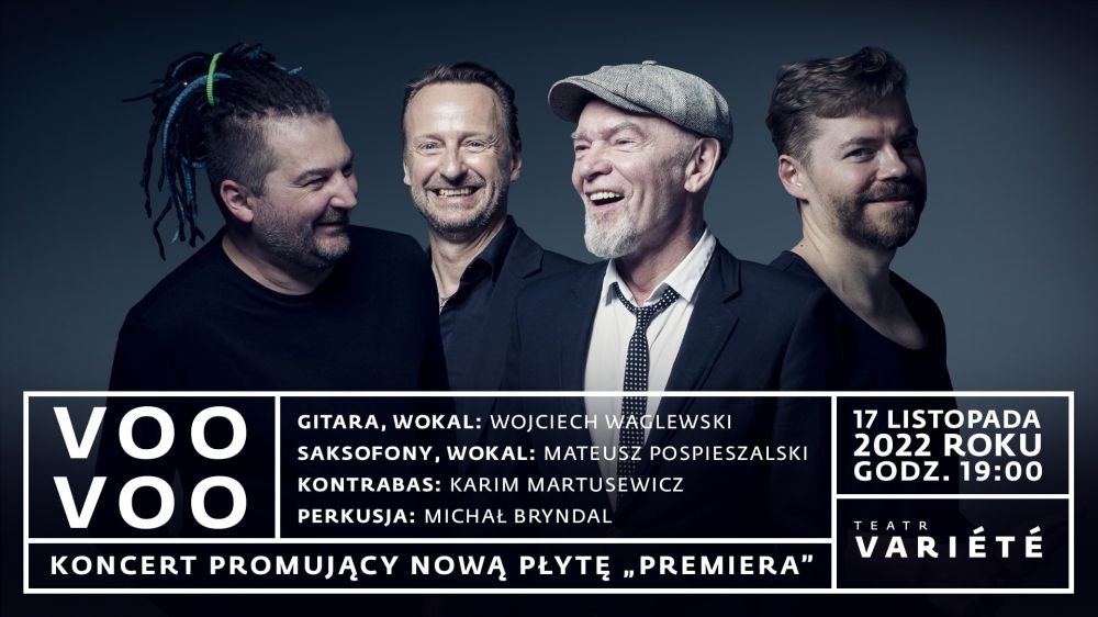 Voo Voo powraca na scenę Krakowskiego Teatru VARIETE 17 listopada 2022 r. z materiałem z nowej płyty "Premiera", która trafi do sprzedaży już 28 października. Na krążku znajdzie się 11 autorskich utworów, w tym "Ochota" i "Bezruch" z gościnnym udziałem Hani Rani oraz "Łajba" powstała we współpracy z Mashą Natanson.