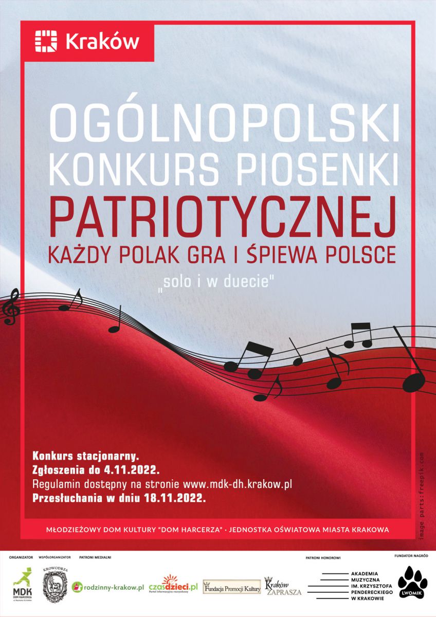 Informacje o konkursie na stronie: https://www.mdk-dh.krakow.pl/konkursy/1124-konkurs-piosenki-patriotycznej-2022