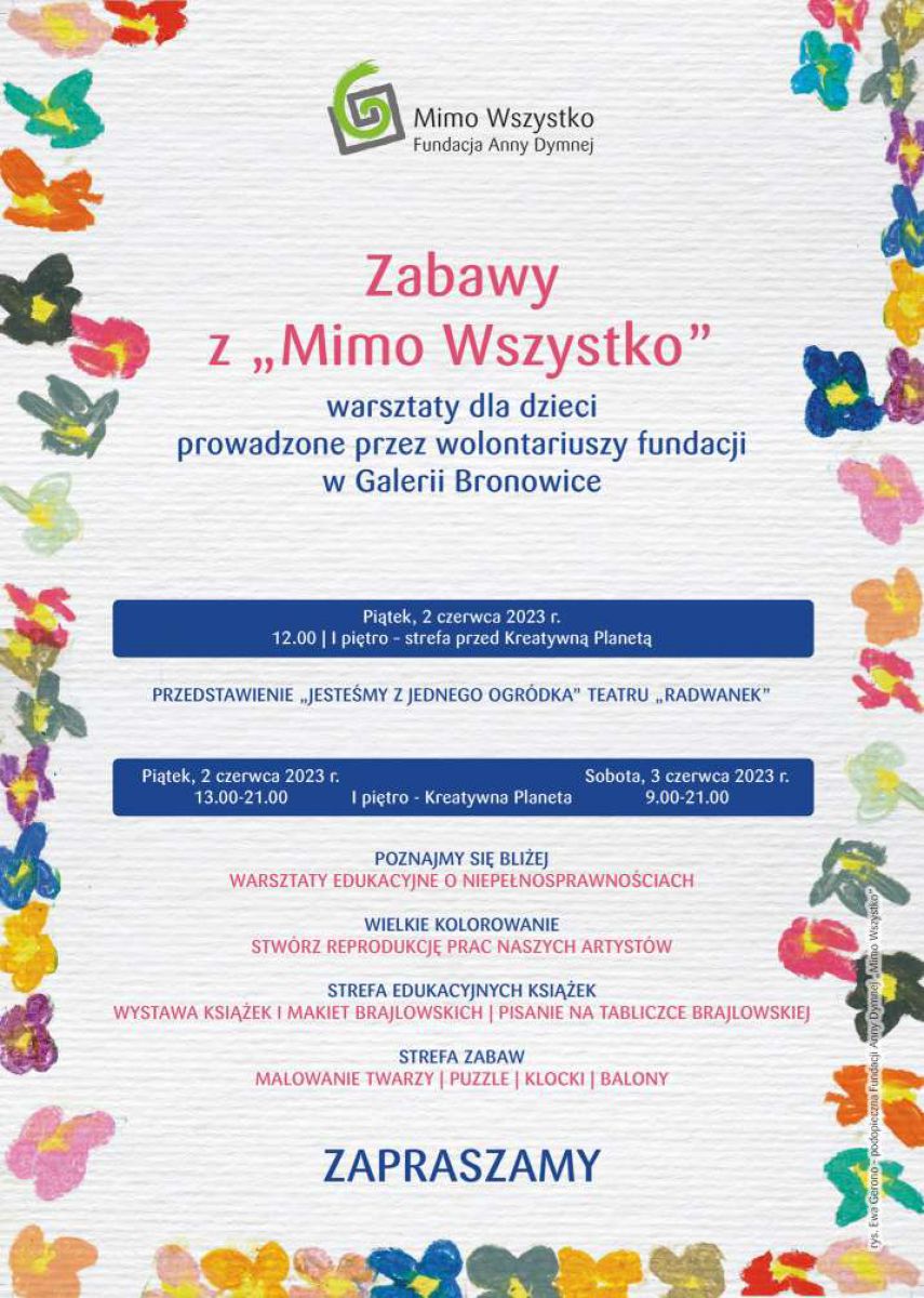 Już w najbliższy piątek i sobotę w Galerii Bronowice pojawią się wolontariusze oraz podopieczni fundacji Anny Dymnej, „Mimo Wszystko”, aby umilić czas najmłodszym, ale też… oswajać niepełnosprawności. Swoją obecność zainaugurują 2 czerwca, o godz. 12:00, w strefie przed Kreatywną Planetą, przedstawieniem „Jesteśmy z jednego ogródka” w wykonaniu podkrakowskiego Teatru „Radwanek”. Scenariusz spektaklu stworzyła Anna Dymna na podstawie utworów Jana Brzechwy. W dniach 2-3 czerwca, w lokalu Kreatywna Planeta, będzie można natomiast wziąć udział w warsztatach edukacyjnych o niepełnosprawnościach, malowaniu buziek, układaniu puzzli czy stworzyć reprodukcję prac podopiecznych fundacji. Ponadto zorganizowana zostanie wystawa książek oraz makiet brajlowskich. Biorący udział w wydarzeniu będą mieli również szansę spróbowania swoich sił w piśmie punktowym dla niewidomych.