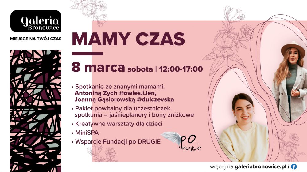 W sobotę, 8 marca, w Galerii Bronowice z okazji Dnia Kobiet i z myślą o wszystkich mamach zrealizowane zostanie wydarzenie „Mamy czas”. Paniom biorącym w nim udział zaproponowane zostaną rozwiązania dla ciała i ducha, które pozwolą oderwać się od codziennych trosk i obowiązków. O doskonałą i pełną akceptacji atmosferę zadbają inspirujące mamy, znane ze świata Internetu. Antoninę Zych (@owies.i.len) oraz Joannę Gąsiorowską (@dulczevska) obserwuje łącznie ponad 300 000 użytkowników. W Galerii Bronowice popularne influencerki parentingowe opowiedzą o radościach i wyzwaniach związanych z macierzyństwem, odpowiedzą na pytania uczestniczek i zapozują do wspólnych, pamiątkowych zdjęć.