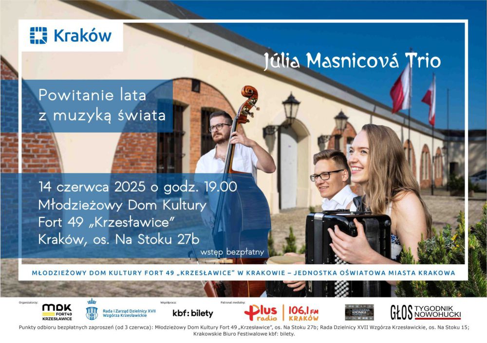 Koncert plenerowy odbędzie się w sobotę 14 czerwca 2025 roku, o godz. 19.00 na dziedzińcu fortecznym Młodzieżowego Domu Kultury Fort 49 „Krzesławice” w Krakowie os. Na Stoku 27b.