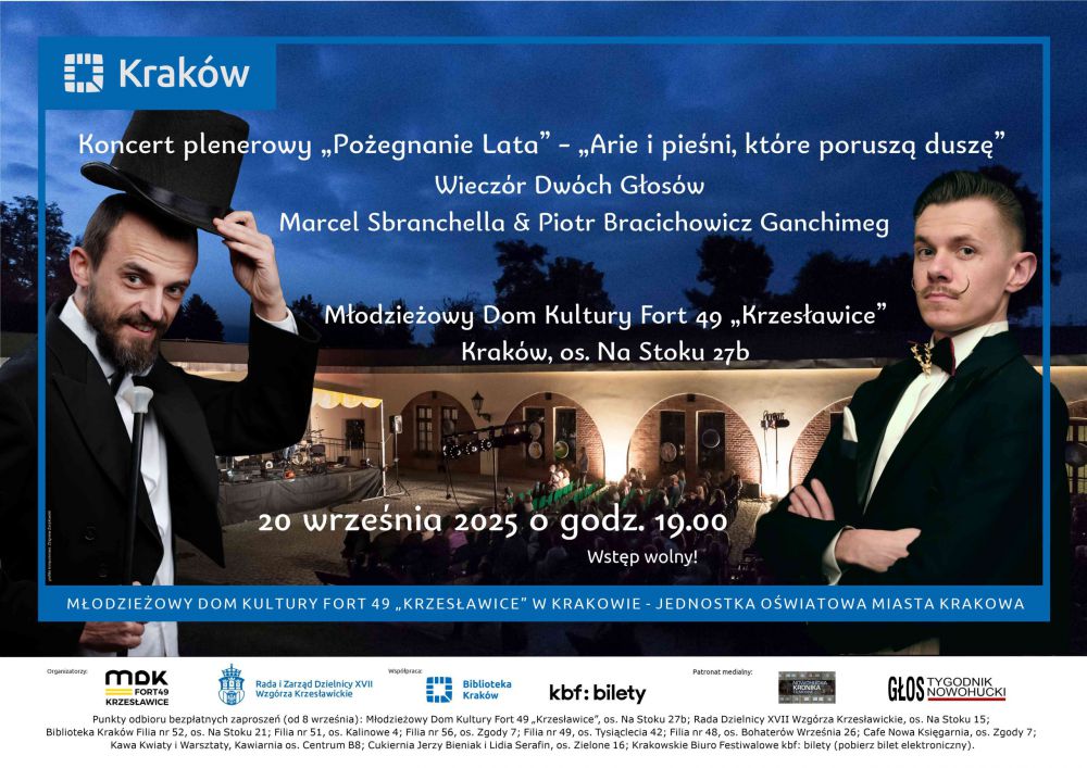 Koncert plenerowy odbędzie się na placu fortecznym Młodzieżowego Domu Kultury Fort 49 „Krzesławice”. Wydarzenie organizowane w ramach cyklu „Pożegnanie Lata”.
