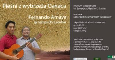 W najbliższy czwartek, 14. paŸdziernika 2010 roku, o godz. 18.00, Muzeum Etnograficzne w Krakowie zaprasza do Ratusza, na koncert trubadurów z południowego Meksyku, połšczony z pokazem slajdów. Muzycy, ojciec i syn, Fernando Amaya i Fernando Escobar goszczš w Polsce w ramach etnomuzykologicznego projektu badawczego „Pieœni z wybrzeża Oaxaca". Spotkanie poprowadzi Joanna Dubrawska-Stępniewska, absolwentka dziennikarstwa i muzykologii na Uniwersytecie Warszawskim, autorka projektu.