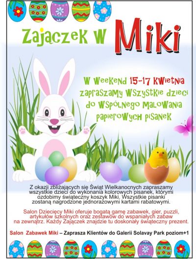 Salon zabawek Miki w Galerii Handlowej Solvay Park zaprasza najmłodszych milusińskich do wspólnej przedwištecznej zabawy. W najbliższy weekend, 16-17 kwietnia, własnoręcznie wykonanymi pisankami ozdobimy wišteczny koszyk Miki.