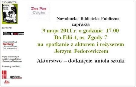 W Tygodniu Bibliotek (8-15 maja 2011), którego tegoroczne hasło brzmi Biblioteka zawsze po drodze, nie mijam wchodzę odbędzie się spotkanie z Jerzym Fedorowiczem aktorem, reżyserem, wieloletnim dyrektorem naczelnym i artystycznym Teatru Ludowego. Jerzy Fedorowicz będzie czytał fragmenty ksišżki Mariusza Wollnego pt. "Kacper Ryx", która w najbliższym czasie zostanie zakupiona do Oddziału Ksišżki Mówionej Nowohuckiej Biblioteki Publicznej.