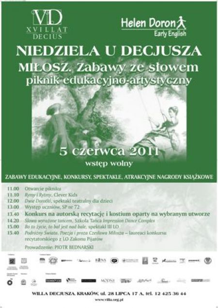 Stowarzyszenie Willa Decjusza oraz Centrum Helen Doron zapraszajš w niedzielę, 5 czerwca, od 11.00 do 16.00, na plener edukacyjny o charakterze pikniku rodzinnego. Jak co roku plener w ogrodach otaczajšcych Willę Decjusza organizowany jest z okazji Dnia Dziecka. W nawišzaniu do obchodów Roku Czesława Miłosza tematem wiodšcym tegorocznej „Niedzieli u Decjusza” będzie życie i twórczoœć polskiego Noblisty oraz szeroko rozumiana twórczoœć literacka.
