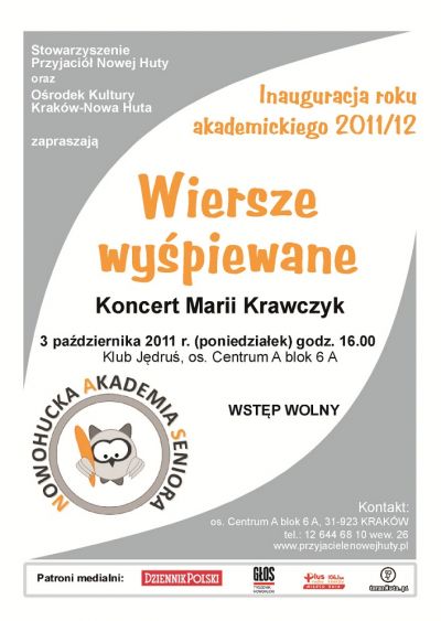 Stowarzyszenie Przyjaciół Nowej Huty i Oœrodek Kultury Kraków-Nowa Huta zapraszajš seniorów na uroczystš inaugurację nowego roku akademickiego 2011/2012.