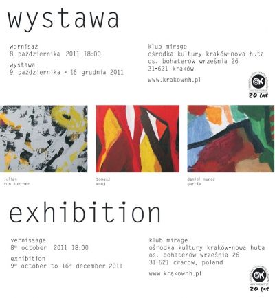 Klub Mirage Orodka Kultury Kraków Nowa Huta (os. Bohaterów Wrzenia 26) zaprasza 8 padziernika (sobota) 2011 r. o godz. 18.00 na Międzynarodowš Wystawę Malarstwa Abstrakcyjnego Daniela Munozy Garcia(Hiszpania), Juliana von Hoernera (Niemcy), Tomasza Wooja (Niemcy), która jest fragmentem międzynarodowego projektu Krakou young, powerfull, international.