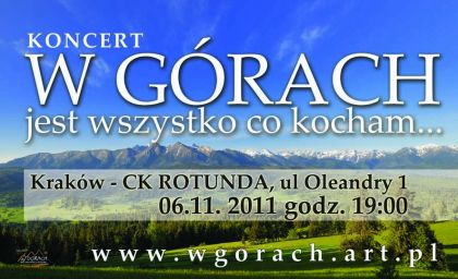 Kto uległ magii gór, wie o czym mowa o nieodpartej potrzebie powrotu, o nieustajšcych wspomnieniach, o tęsknocie, kiedy jest się od gór daleko i euforii, gdy jest się w ich sercu. O tym, że góry stajš się osiš życia. Z tych wrażeń powstaje co więcej, wyrasta z nich chęć utrwalenia tego, co ulotne. Utrwalenia, choć a jakże jest jasne, że nie da się zatrzymać nieuchwytnego. Co jednak udaje się nam zachować: muzykę, poezję, a także co może najważniejsze przyjanie, nawet miłoci. Spotkania ludzi, którzy stworzyli wspólnotę dzięki pasji, zapoczštkowały regularne koncerty pod sztandarem hasał :" W górach jest wszystko co kocham" pochodzšcym z poezji Harasymowicza. Po raz kolejny spotkamy się w tych magicznych klimatach w CK ROTUNDA. Jeli chcecie do nas dołšczyć, zapraszamy Was na wspólnš wędrówkę po górskich szlakach - oraz po szlakach wyobrani.