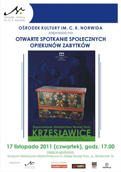 Otwarte spotkanie Społecznych Opiekunów Zabytków powięcone historii i zabytkom Krakowa odbędzie się przy najnowszej wystawie w Muzeum Historycznym Miasta Krakowa Oddział Dzieje Nowej Huty. Wystawa powięcona jest Krzesławicom, podkrakowskiej wsi, która ze względu na swoje położenie w pasie izolacyjnym, oddzielajšcym kombinat metalurgiczny od osiedli mieszkaniowych Nowej Huty, stanowi niejako relikt dawnego krajobrazu w centrum miasta. Na wystawie prezentujšcej eksponaty zwišzane z dziejami wsi i jej włacicieli oraz mieszkańców, zobaczyć można zarówno odkryte na tym terenie archeologiczne przedmioty należšce do najstarszych osadników, reprodukcje najdawniejszych dokumentów wymieniajšcych nazwę Krzesławice, a także rękopisy księdza Hugona Kołłštaja, Kazimierza Girtlera czy rysunki Jana Matejki, wykonywane w jego podkrakowskiej rezydencji. Prezentowane sš także obiekty zebrane w latach 70. XX wieku podczas akcji Ocalić od zapomnienia, które miały posłużyć jako wyposażenie planowanego w Krzesławicach skansenu, a także makieta krzesławickiego fortu, wykonana na zlecenie Młodzieżowego Domu Kultury Fort 49 Krzesławice, obecnego użytkownika obiektu. Serdecznie zapraszamy.