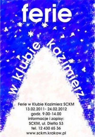 W tegorocznej ofercie Klubu Kazimierz czekajš na Was warsztaty plastyczne i rękodzieła, gry i zabawy integracyjne, ciekawe wyjcia kulturalne oraz zajęcia rekreacyjnosportowe: zawody zręcznociowe, turnieje piłki halowej, tenisa stołowego, piłkarzyków, wyjcia na basen i na lodowisko, łamigłówki, rozgrywki grupowe itp. Pod koniec każdego dnia nastšpi prezentacja i podsumowanie działań.