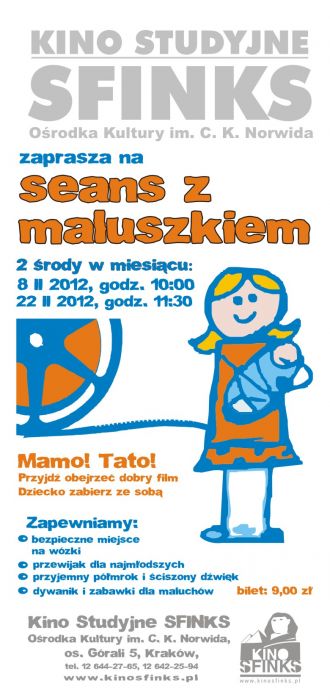 Podczas cyklu SEANS Z MALUSZKIEM proponujemy wspólne, dopołudniowe projekcje dobrych filmów, na które zapraszamy rodziców wraz z dziećmi gwarantujšc szczególnie dobrany repertuar (kino o wysokich walorach zdjęciowych i muzycznych, bez scen przemocy), zaplecze organizacyjne przyjazne rodzicom (przewijak dla najmłodszych, bezpieczne miejsce na wózki oraz możliwoœć pozostawienia dzieci w wieku 1.5 - 4 lat pod opiekš w pomieszczeniach obok kina) a także przyjemny półmrok na sali kinowej i œciszony dŸwięk dla tych rodziców, którzy zechcš oglšdnšć film w towarzystwie swojej pociechy. Spotkania odbywajš się w Kinie Sfinks dwa razy w miesišcu, w godzinach dopołudniowych.