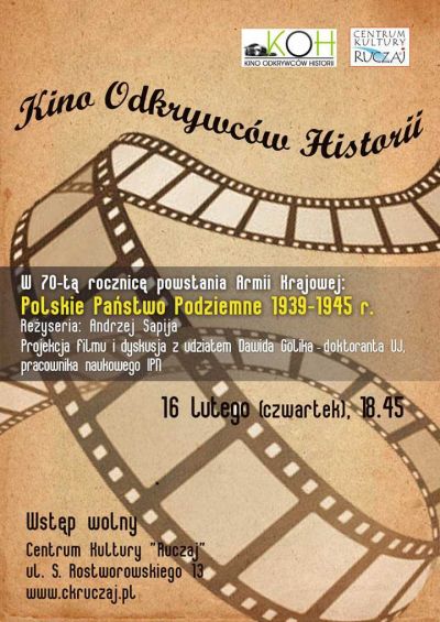 16 lutego (czwartek) o godz. 18:45 zapraszamy do Centrum Kultury "Ruczaj" na spotkanie z cyklu Kino Odkrywców Historii, w 70-tš rocznicę powstania Armii Krajowej. Zaprezentowany zostanie film "Polskie Państwo Podziemne 1939-1945 r.".