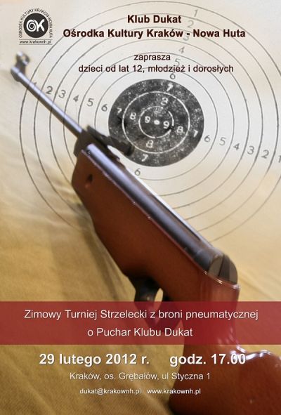 Klub Dukat Oœrodka Kultury Kraków-Nowa Huta (ul. Styczna 1) zaprasza 29 lutego (œroda) 2012 r. o godz. 17.00 na turniej strzelecki z broni pneumatycznej.