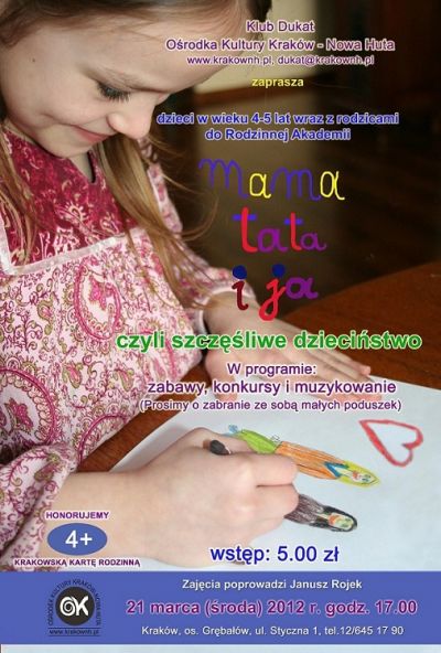 Klub Dukat Orodka Kultury Kraków-Nowa Huta (ul. Styczna 1) zaprasza 21 marca (roda) 2012 r. w godz. 17.00 18.00 na zajęcia w ramach Rodzinnej Akademii.