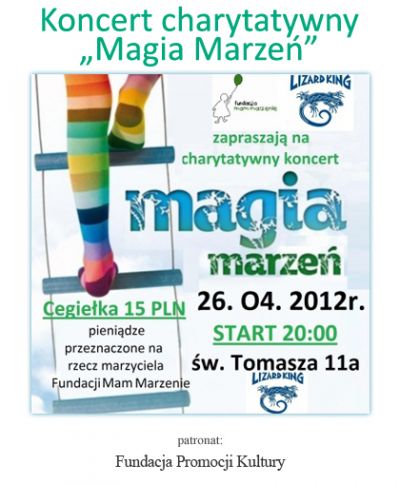 Jak wielka jest siła dziecięcych marzeń Fundacja Mam Marzenie postara się udowodnić podczas koncertu charytatywnego „Magia Marzeń”, który odbędzie się 26 kwietnia 2012 roku w klubie Lizard King w Krakowie. Koncert jest kontynuacjš inicjatywy wolontariuszy z warszawskiego oddziału fundacji, którzy w 2010 roku po raz pierwszy zorganizowali „Magię Marzeń”. Był on realizacjš pragnienia jednego z podopiecznych fundacji – Mateusza. Chłopiec, zakochany w muzyce, chciał zwišzać z niš swojš przyszłoœć i marzył o pozostawieniu innym czšstki siebie. Wyrazem tego miała być własna piosenka, nagrana przez Mateusza. Jedna z marzycielek, Natalia, napisała wiersz w podziękowaniu za zrealizowane marzenie, do tekstu została skomponowana melodia i tak powstał utwór „Wspomnienia”. Niestety Mateusz przegrał z chorobš, a kilka miesięcy póŸniej odeszła również Natalka. Pomimo tego wolontariusze Fundacji postanowili zrealizować marzenie Mateusza, nagrywajšc jego piosenkę i organizujšc koncert.