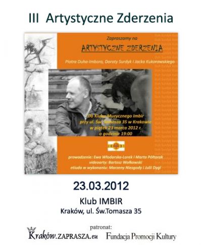 Tym razem zderzymy trzy interesujšce osobowoci twórcze : Dorotę Surdyk i Jacka Kukorowskiego (poetów) oraz Piotra Duha Imbora (grafika). Gocinnie wystšpiš Marzena Niezgoda z Juliš Dyga, które zaprezentujš etiudę pantomimicznš pt. "Kolory", inspirowanš twórczociš Urszuli Kozioł.