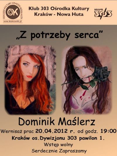 Klub 303 Oœrodka Kultury Kraków-Nowa Huta (os. Dywizjonu 303 1) zaprasza na otwarcie indywidualnej wystawy prac Dominika Maœlerza, w ramach cyklu Z potrzeby serca…