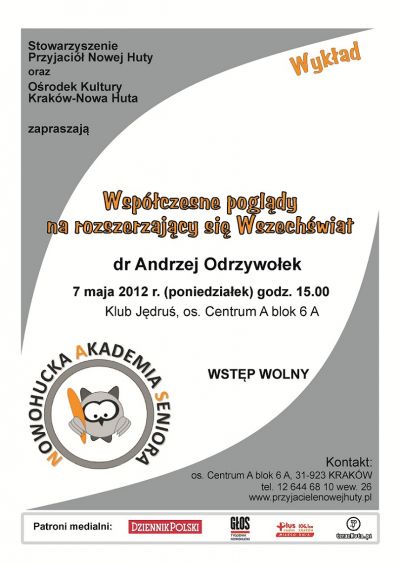 Wykład odbędzie się 7 maja 2012 r. (poniedziałek) o godz. 15.00 w Klubie Jędruœ Oœrodka Kultury Kraków-Nowa Huta (os. Centrum A 6a).