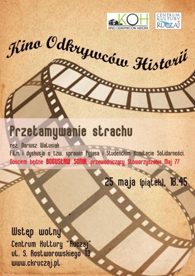 Centrum Kultury "Ruczaj" zaprasza na projekcję filmu "Przełamywanie strachu" i dyskusję o tzw. sprawie Pyjasa i Studenckim Komitecie Solidarnoci. Gociem będzie Bogusław Sonik, przewodniczšcy Stowarzyszenia Maj 77.