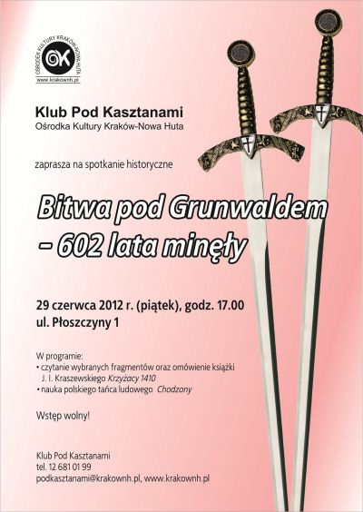 Klub Pod Kasztanami Oœrodka Kultury Kraków-Nowa Huta (ul. Płoszczyny 1) zaprasza na spotkanie poœwięcone twórczoœci Józefa Ignacego Kraszewskiego, ze szczególnym uwzględnieniem powieœci historycznej Krzyżacy 1410: Obrazy z przeszłoœci, wydanej z okazji 600-ej rocznicy grunwaldzkiej bitwy.