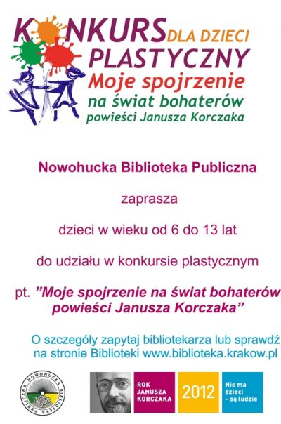 Z okazji Roku Janusza Korczaka Biblioteka ogłosiła konkurs plastyczny pt. „Moje spojrzenie na œwiat bohaterów powieœci Janusza Korczaka” polegajšcy na przygotowaniu ilustracji do wybranej powieœci Janusza Korczaka przy wykorzystaniu dowolnej techniki: rysunek kredkš, ołówkiem, tuszem, malarstwo na papierze, collage, witraż bšdŸ wydzieranka. Konkurs adresowany jest do uczniów szkół podstawowych i trwa od 25 VI do 30 IX 2012 r. Prace można wykonać w wybranej placówce NhBP pod kierunkiem bibliotekarza lub samodzielnie w domu. Szczegółowy harmonogram imprez, regulamin konkursu plastycznego oraz godziny otwarcia placówek dostępne sš na stronie WWW.biblioteka.krakow.pl