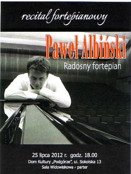 Recital fortepianowy na którym Paweł Albiński wykona swoje autorskie kompozycje oraz inne utwory fortepianowe z epoki romantyzmu i muzyki współczesnej. Wród kompozytorów których usłyszymy znajdš się takie nazwiska jak Cziffra, Piazzola czy MacDowell.