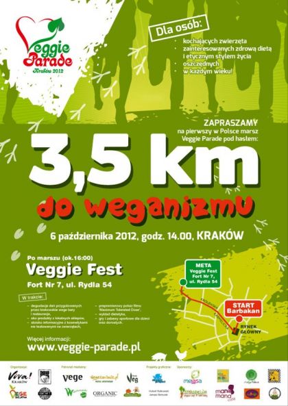 W ramach Veggie Parade w Krakowie, 6-ego paŸdziernika, organizatorzy planujš masowy marsz z transparentami, skandowaniem haseł, rozdawaniem ulotek, instrumentami ulicznymi (tzw. samba), muzykš z sound systemu, tall-bike’ami i innymi widowiskowymi elementami. Ruszymy spod Barbakanu na Rynek Główny, gdzie odczytamy manifest w języku polskim i angielskim, a następnie ulicš Karmelickš i Królewskš pójdziemy w kierunku Fortu Nr 7 (ul. Rydla) - na zakończenie Parady w postaci veggie festynu.