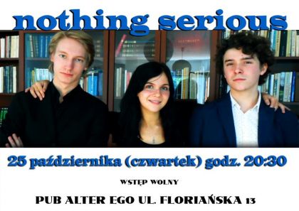Krakowski zespół, Nothing Serious, został założony w 2011 r. przez grupę połšczonych wspólnš pasjš młodych muzyków i już wówczas został dostrzeżony na XXIV Festiwalu ‘Talenty Małopolski 2011’ gdzie otrzymał nagrodę głównš. Formacja to akustyczne trio ciekawie łšczšce różne gatunki muzyki od country, folku celtyckiego i argentyńskiego po blues i jazz.