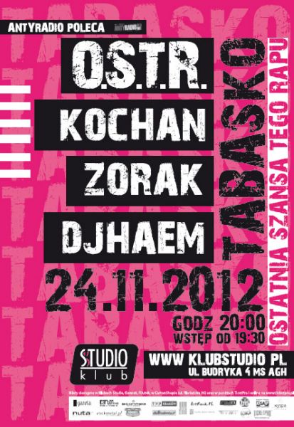 Sobota 24 listopada przyniesie koncert hip-hopowy w Klubie Studio. Na scenie zaprezentuje się projekt Tabasko tworzony wspólnymi siłami O.S.T.R. – jednego z najbardziej uznanych polskich raperów – oraz Kochana i DJ Haema. Formacja powstała w 2002 roku w Łodzi, zaœ w roku 2011 jej skład wzbogacił beatboxer Zorak.