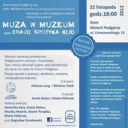 „Muza w muzeum czyli Erato spotyka Klio” to nowy cykl spotkań w Domu Historii Podgórza, który łšczy w sobie narrację historycznš z liryki. Każde zespotkań poœwięcone zostanie innemu tematowi zwišzanemu z historiš krakowskiego Podgórza.