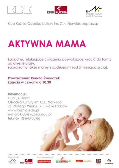 Zapraszamy do Klubu Kunia Orodka Kultury im. C.K.Norwida, os. Zotego Wieku 14, godz. 10.30-11.20 na zajcia dla mam z dziemi: Aktywna mama.
